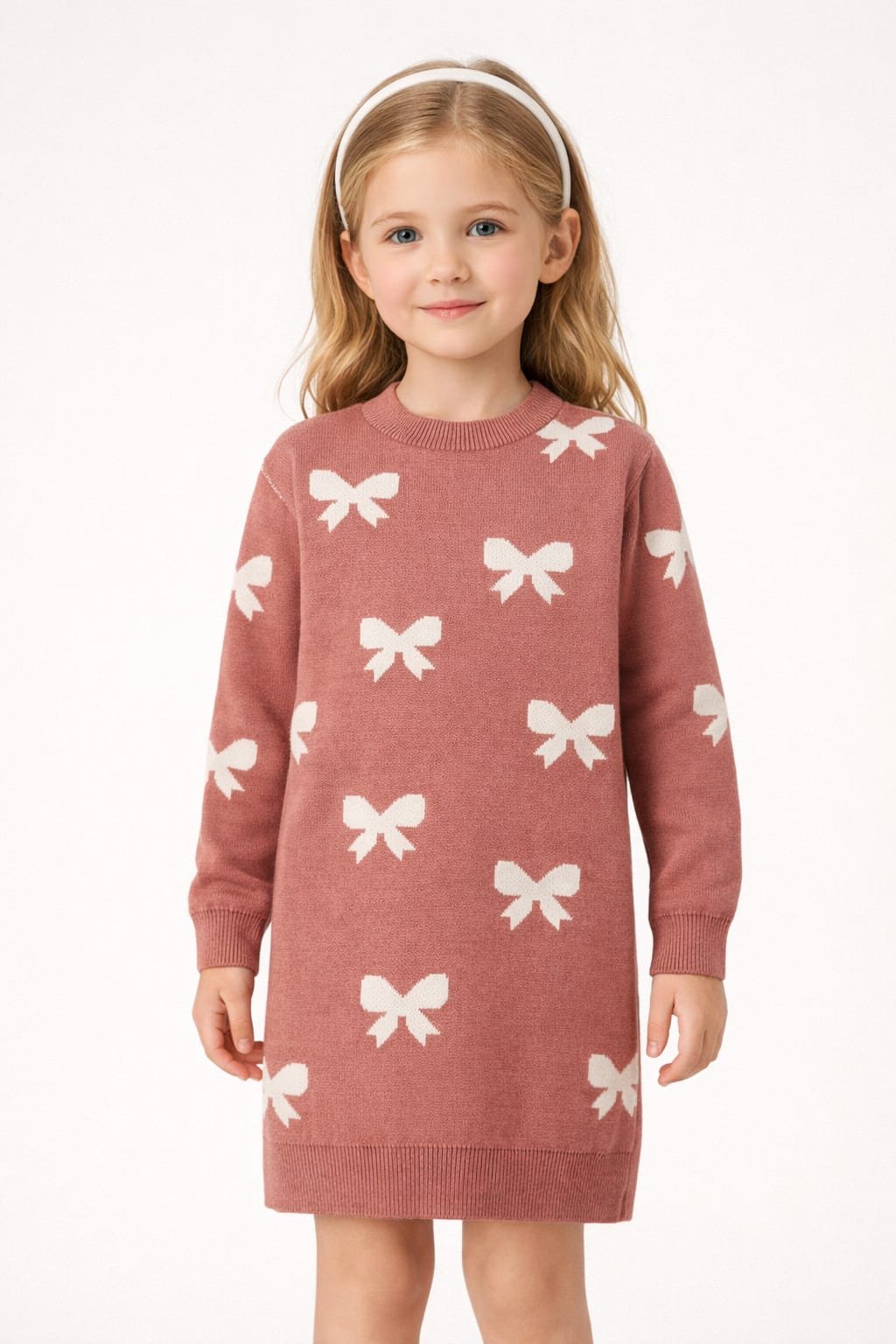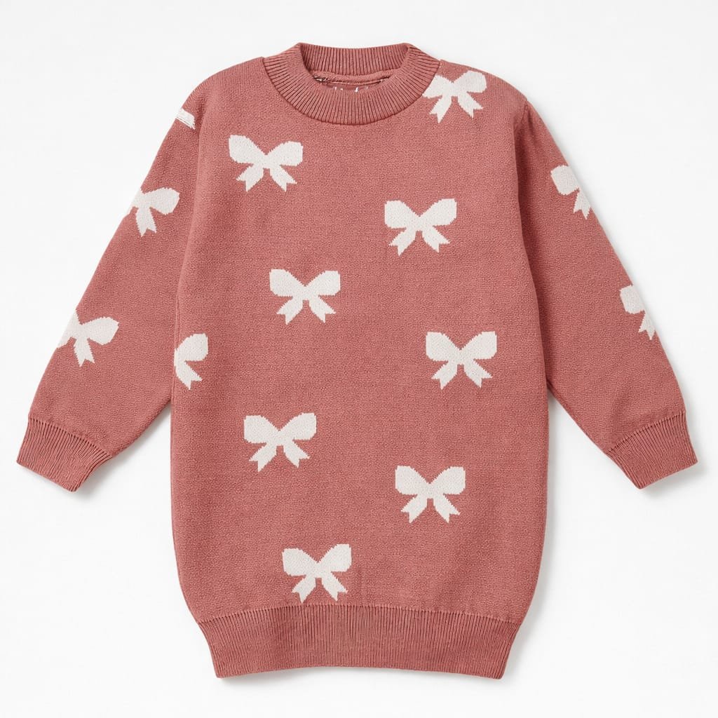 Elegant winter knit dress for girls, made from soft fabric and decorated with cute bow patterns, perfect for outings, special occasions and Eid.